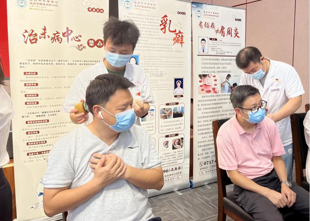 医院专业团队为企业职工免费开展B超检查、测量血压,为失眠、肠胃不调、肩颈酸痛的患者开展火龙罐、棍点理筋、耳穴压豆等特色中医治疗,中医外治法得到了现场青年职工的高度关注和一致欢迎。医院专业药师还现场为大家介绍并展示了医院的特色制剂《吉祥三宝》,免费发放医院自制中药防疫辟瘟香囊,使大家在享受优质中医药服务的同时,增进对中医药的认同。