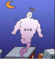 短时间吸入大量苯蒸气可引起急性苯中毒,主要表现为中枢神经系统的症状。起初有流泪、咽痛、咳嗽等黏膜刺激症状,随后出现头痛、头晕、恶心、呕吐、烦躁、步态蹒跚、视物模糊等酒醉状态,病情继续发展还可出现昏迷、抽搐、呼吸和循环衰竭等症状。