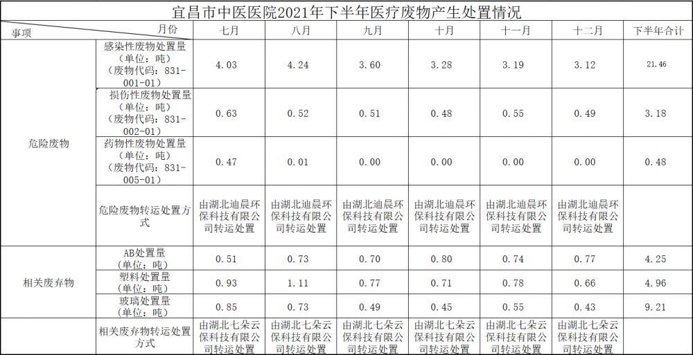 宜昌市中医医院2021年下半年医疗废物产生处置情况