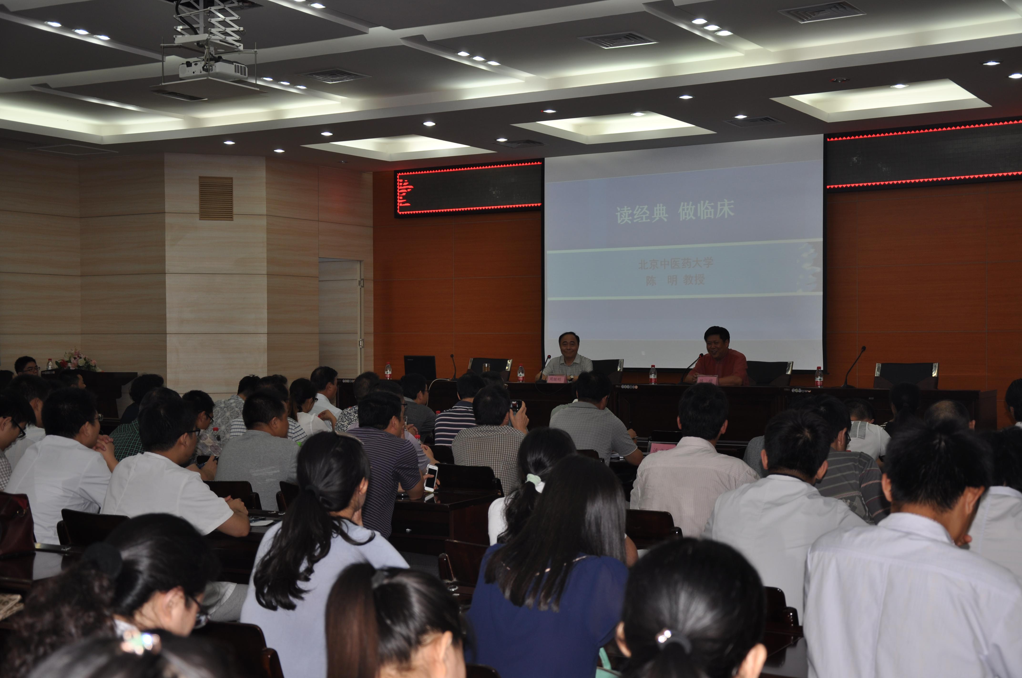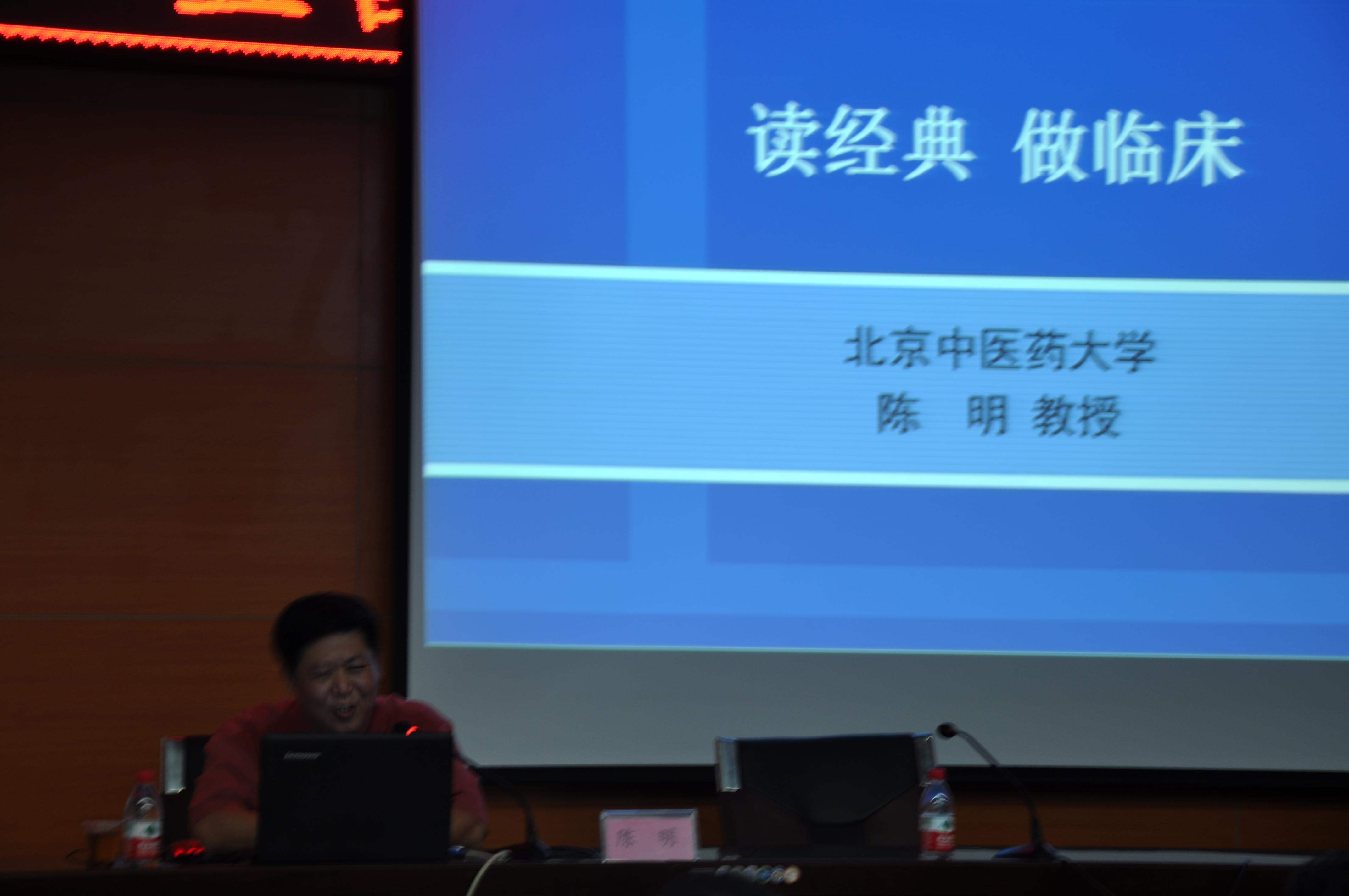 会议15时准时开始,首先陈明教授分析目前中医药发展现状,对中医药从业人员提出殷切希望;接着陈教授从阴阳、五行、藏象、经络、病因病机等方面详细论述了经典的基础地位及对中医临床的指导性作用。两个小时的讲座期间,陈明教授将《黄帝内经》、《伤寒论》等中医经典中蕴涵的丰富治疗韬略结合临床病例进行了妙趣横生的讲解,他幽默风趣的演讲使整个讲座活跃在一片轻松愉悦的氛围中,使大家在欢声笑语中。