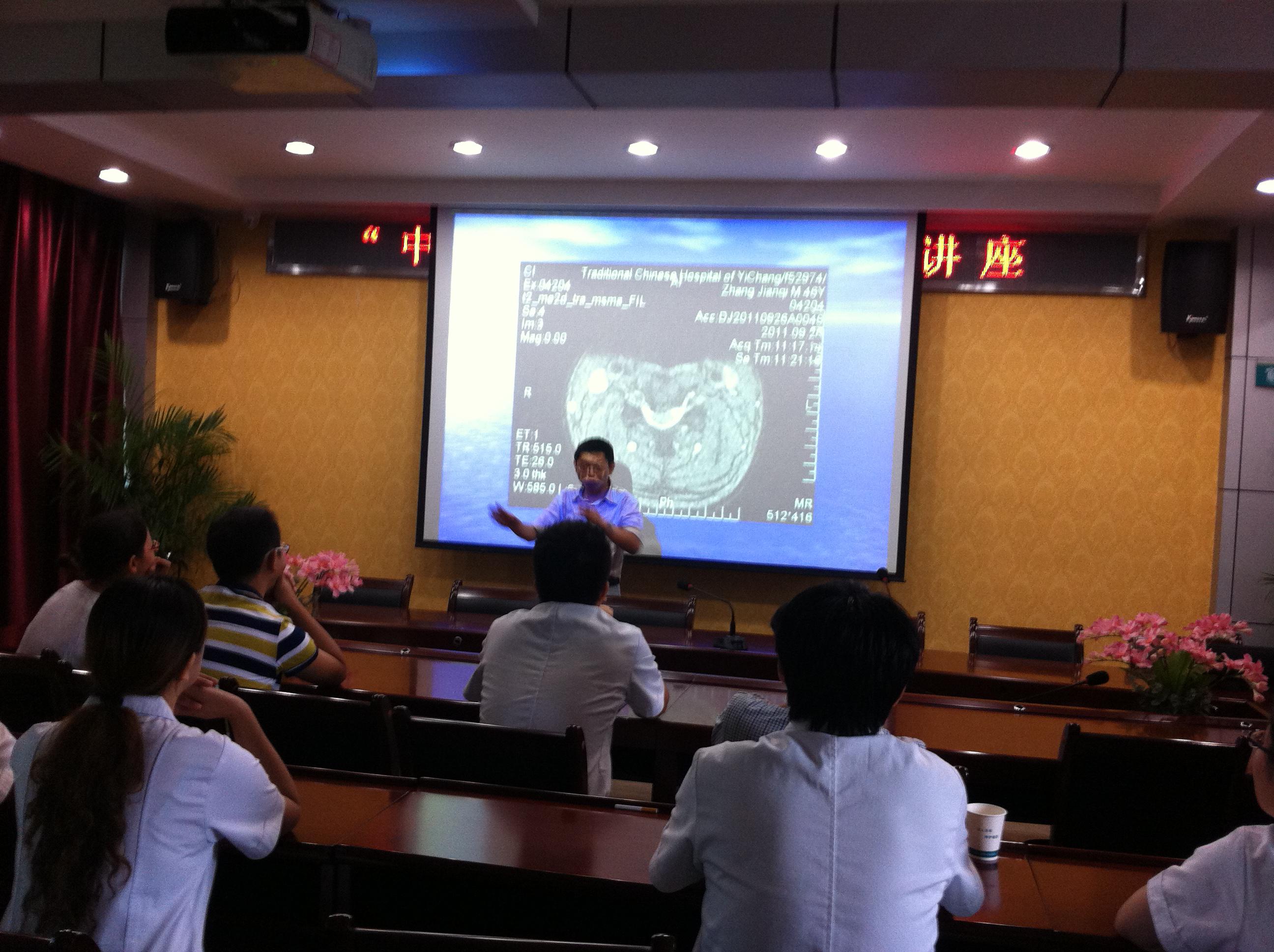 图为放射科主任丁晖为夷陵区小溪塔街道社区卫生服务中心放射科工作人员及医生进行磁共振、64排CT专业讲座