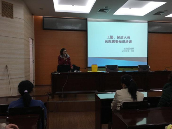 12月14日下午四时,医院感染科联合总务科对全院工勤人员进行了一次以医院感染基础防控知识为主题的培训,强化了工勤人员感控意识,落实了医疗废物管理条例的施行。全院共53名工勤人员参与了培训。