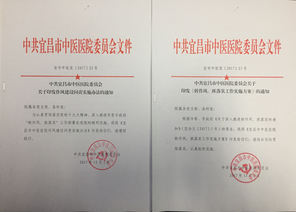 医院出台了《宜昌市中医医院转作风、抓落实工作实施方案》以及《宜昌市中医医院作风建设问责实施办法》,成立“正风肃纪工作专班”,将每一项需要检查落实的工作分配到责任领导、责任科室、责任人,每个科室认真组织学习工作实施方案及问责实施办法,把规矩亮到前面、红线摆到前面。