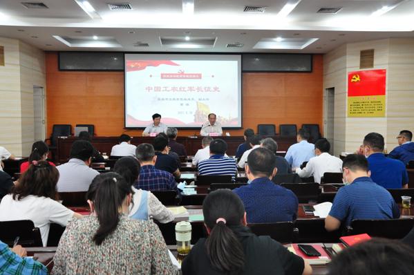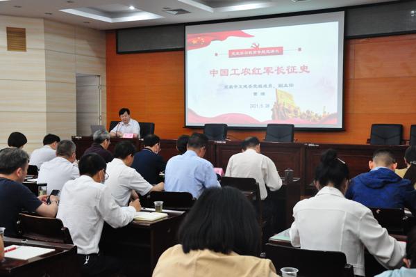 在2个小时的宣讲中,曹源副主任以《中国工农红军长征史》为题,结合习近平总书记在党史学习教育动员大会上的讲话精神,曹主任围绕长征的准备阶段、挫折阶段、转折阶段、分裂阶段、南下阶段、会师阶段,重点回顾了强渡乌江、占领遵义、四渡赤水、飞夺泸定桥等各个时间节点的重大历史事件,生动讲解了中国共产党在1934至1936年的第五次反围剿失败后,中央主力红军为摆脱国民党军队的包围追击,被迫实行战略性转移的艰辛历程。其中既有理论阐释、又有案例剖析,既有总结历史经验的思想启迪、又有紧扣时代发展的实践指导,为在座的党员干部上了一堂生动的党课。