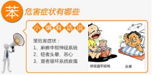 慢性苯中毒主要损害人体的造血系统和神经系统。导致如头痛、头晕、记忆力减退、失眠、多梦、乏力、皮肤黏膜出血、月经异常等,造血系统中毒以白细胞减少最常见,重症患者可出现再生障碍性贫血,白血病。