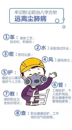 尘肺病预防的关键在于最大限度防止有害粉尘的吸入,只要措施得当,尘肺病是完全可以预防的。我国目前针对防尘降尘制定了“革、水、密、风、护、管、教、查”八字方针,大致内容可分为两个方面: