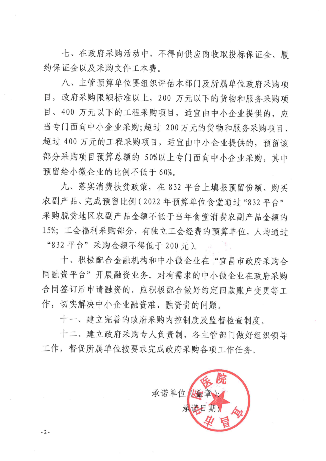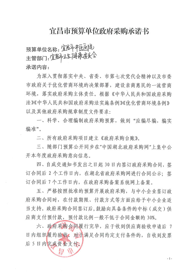 为深入贯彻落实中央、省委、市第七次党代会精神以及市委市政府关于优化营商环境的决策部署,建设亲商惠民的一流营商环境,落实政府采购主体责任。根据《中华人民共和国政府采购法》《中华人民共和国政府采购法实施条例》《优化营商环境条例》以及其他政府采购规章制度文件要求,宜昌市中医医院政府采购承诺公示如下: