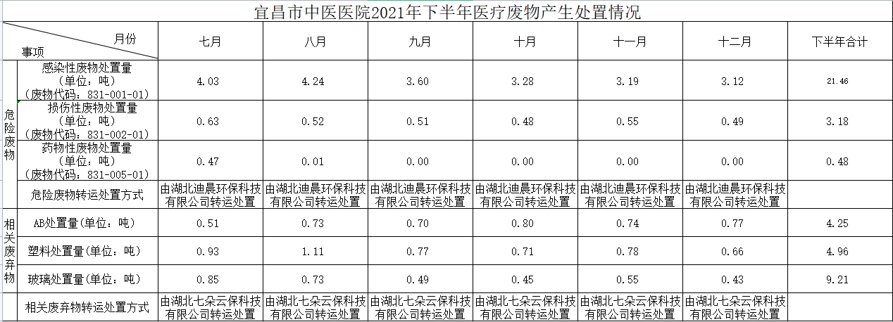 宜昌市中医医院2021年下半年 医疗废物产生处置情况公示