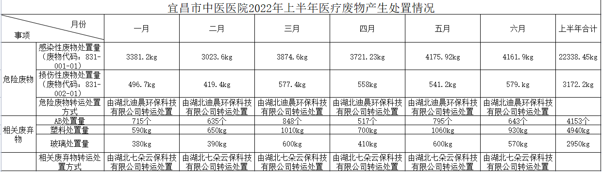 宜昌市中医医院2022年上半年医疗废物产生处置情况公示