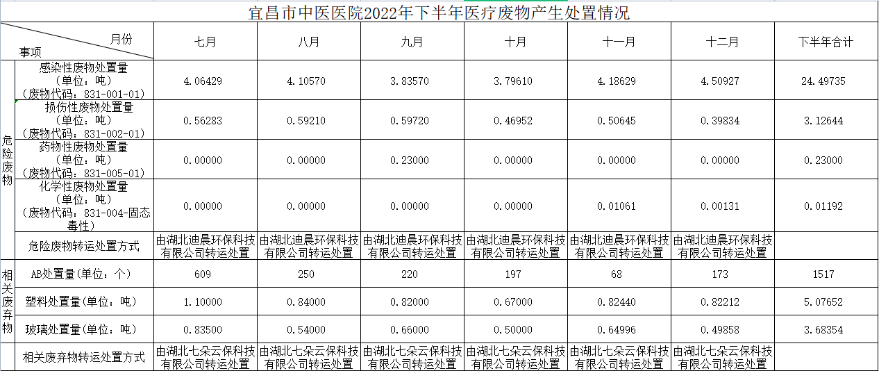 宜昌市中医医院2022年下半年医疗废物产生处置情况公示
