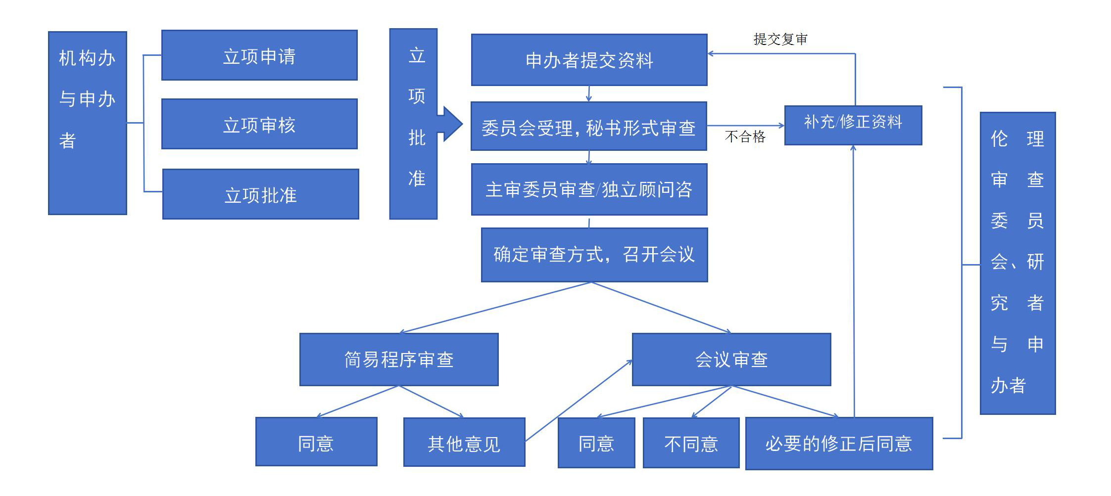 第二十二条 审查方式:伦理审查委员会的审查方式有会议审查(包含紧急会议审查)、简易程序审查。会议审查是伦理审查委员会主要的审查方式。研究过程中出现重大或严重问题,危及研究参与者安全,应召开紧急会议审查。简易程序审查是会议审查的补充形式,目的是提高工作效率,主要适用于研究风险不大于最小风险的研究;已批准的研究方案作较小修改且不影响研究风险受益比的研究;已批准研究的跟踪审查;多机构开展的研究中,参与机构的伦理审查委员会对牵头机构出具伦理审查意见的确认等;伦理审查委员会对于药物/器械临床试验项目实行主审责任制。