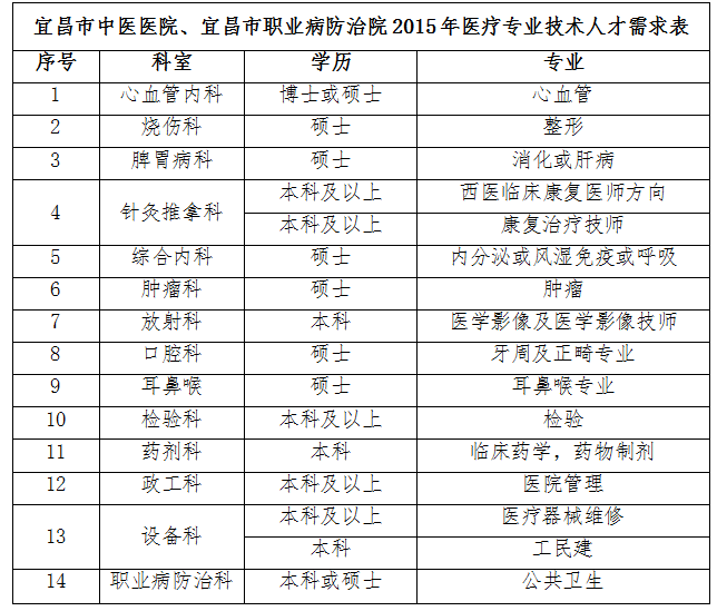 二、招聘岗位。见附件一《宜昌市中医医院、宜昌市职业病防治院2015年医疗专业技术人才需求表》。