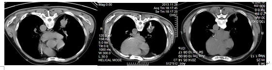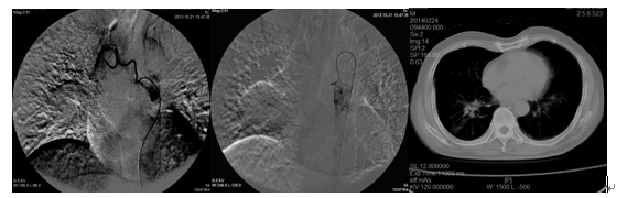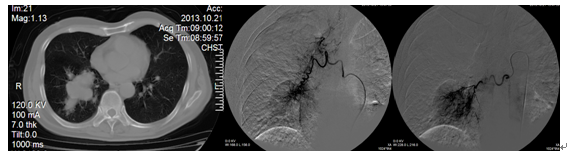 (一)、患者、男、72岁,2013年10月CT +病检提示右肺中心型肺癌,在我院介入诊疗科采用采用支气管动脉造影+化疗栓塞术,术后采用中药调养,一年后复查病灶基本消失。