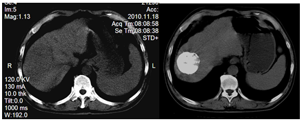 中国占全世界肝癌病例的55%。我们国家的肝癌患者大部分有肝炎和肝硬化的病史,一经发现大部分已到晚期,失去手术机会,而传统放疗及化疗对于人体损伤大,效果差,西医介入治疗对肝脏损伤大,尤其对于年龄大、肝功能差、肝硬化患者疗效差,治疗困难。我院采用中药制剂采用介入栓塞方法对于年龄大,肝功能差及肝硬化患者大部分有很好的疗效,对于年龄大,合并糖尿病等不适于血管介入治疗的患者采用CT引导下行射频消融治疗,术后结合中药治疗,效果满意!
