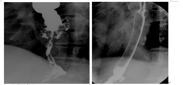 男、84岁、2012年11月在我院食道造影显示晚期食道癌致纵隔漏,患者反复感染,体质差,行食道覆膜支架一月后复查患者感染消除,身体恢复良好。