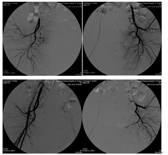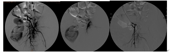 女、宫颈癌盆腔广泛转移腹部剧烈疼痛,在我院采用中药制剂结合介入盆腔内肿瘤血管灌注术后,肿瘤血管闭塞,疼痛明显减轻,睡眠改善。