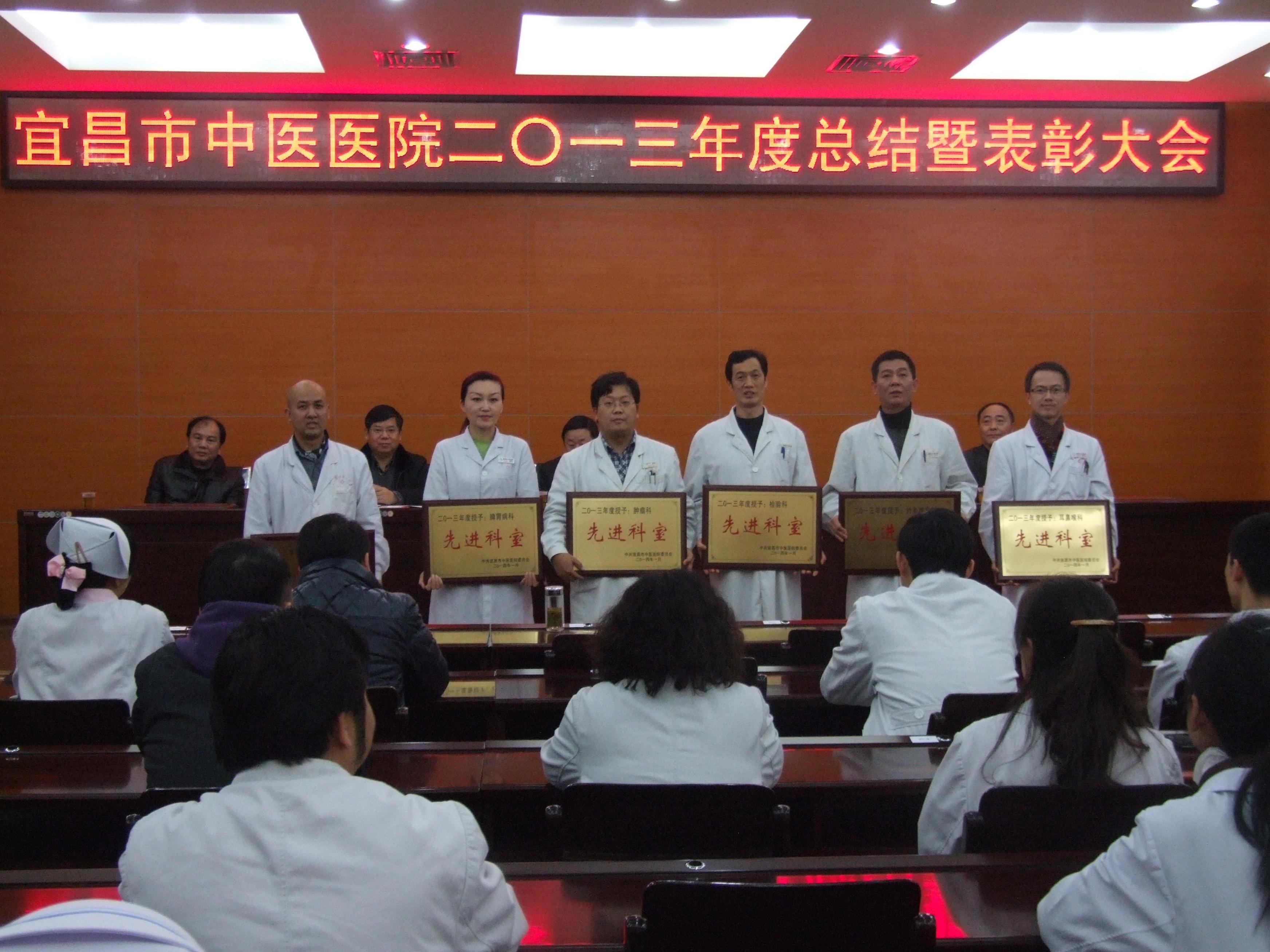 2013年工作总结中,全面的总结了医院在过去一年中所取得的成绩,并对新一年的工作做了令人鼓舞的展望及部署。 接下来,副院长周继刚宣读了宜昌市中医医院关于表彰2013年度先进科室、先进个人的决定,市卫计委领导和院领导为综合内科等6个先进科室、肛肠科等4个单项奖科室及刘晓敏等77名先进工作者颁发了奖牌和获奖证书。