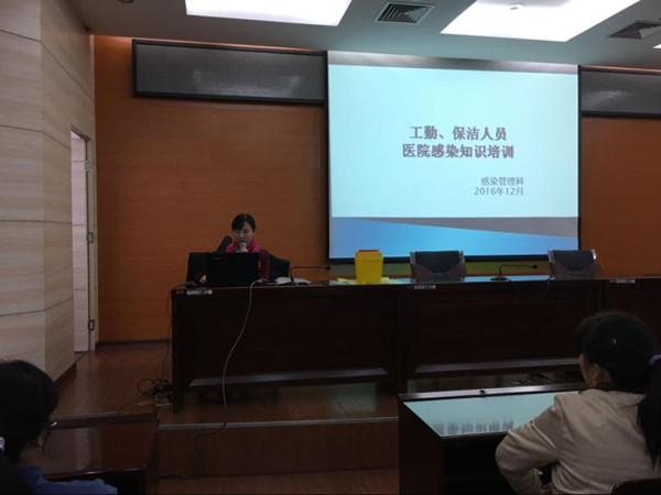 12月14日下午四时,医院感染科联合总务科对全院工勤人员进行了一次以医院感染基础防控知识为主题的培训,强化了工勤人员感控意识,落实了医疗废物管理条例的施行。全院共53名工勤人员参与了培训。