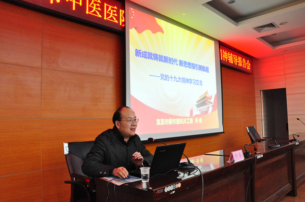 2017年12月13日下午,我院举办了学习贯彻十九大精神辅导报告会,会议邀请宜昌市委宣讲团成员、市直机关工委副书记许睿同志进行专题授课,医院领导班子成员、中层干部以及党员代表共计113人参加了辅导报告会。